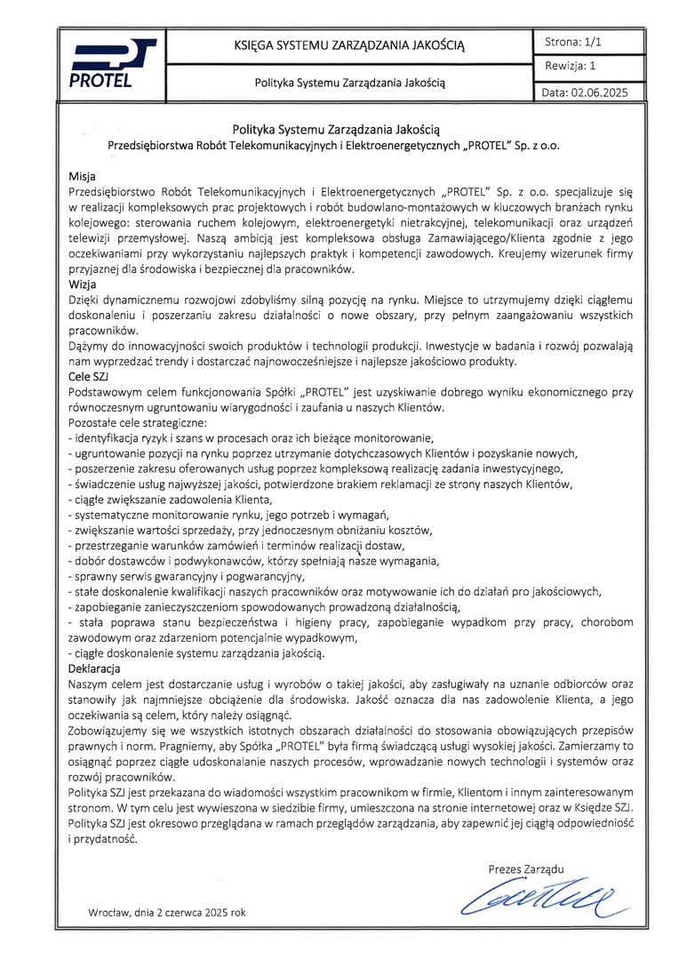 Wdrożony system zarządzania gwarantuje wysoką jakość realizowanych usług, zgodność z obowiązującymi normami i przepisami oraz stałe doskonalenie procesów. Certyfikat ISO potwierdza nasze zaangażowanie w niezawodność, bezpieczeństwo oraz profesjonalną obsługę na każdym etapie realizacji inwestycji – od projektu, przez wykonanie, aż po serwis i utrzymanie systemów.