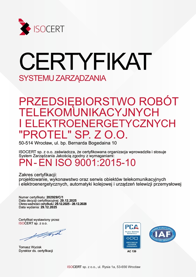 Wdrożony system zarządzania gwarantuje wysoką jakość realizowanych usług, zgodność z obowiązującymi normami i przepisami oraz stałe doskonalenie procesów. Certyfikat ISO potwierdza nasze zaangażowanie w niezawodność, bezpieczeństwo oraz profesjonalną obsługę na każdym etapie realizacji inwestycji – od projektu, przez wykonanie, aż po serwis i utrzymanie systemów.